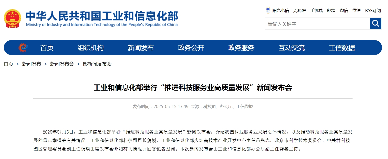 5 月 15 日,工业和信息化部召开 “推进科技服务业高质量发展” 新闻发布会,介绍我国科技服务业发展的整体状况及推动其高质量发展的重点举措等相关情况。会上透露,工信部将持续深化产业与金融的合作,深入实施 “科技产业金融一体化” 专项行动。