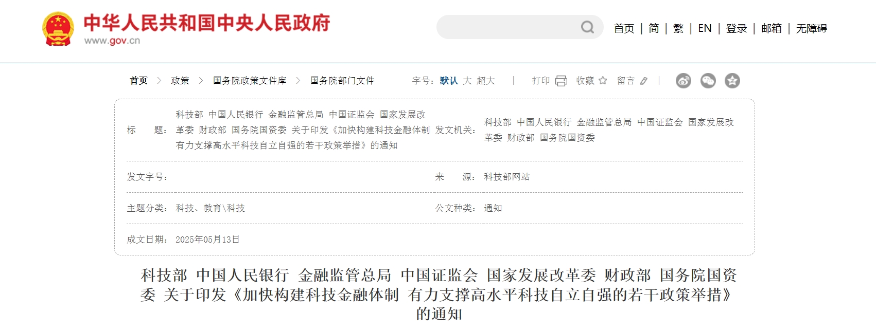 To strengthen financial support for technological innovation, seven Chinese government departments, including the Ministry of Science and Technology and the People’s Bank of China, jointly released new policies to build a sci-tech finance system. The measures include establishing a national venture capital fund to boost strategic and emerging industries, accelerate commercialization of major scientific achievements, and foster new quality productive forces. The Ministry of Industry and Information Technology (MIIT) will deepen industry-finance collaboration, focusing on early-stage projects in biomedicine, AI, digital tech, and low-altitude economy, while linking innovation resources with financial capital to advance high-quality initiatives.